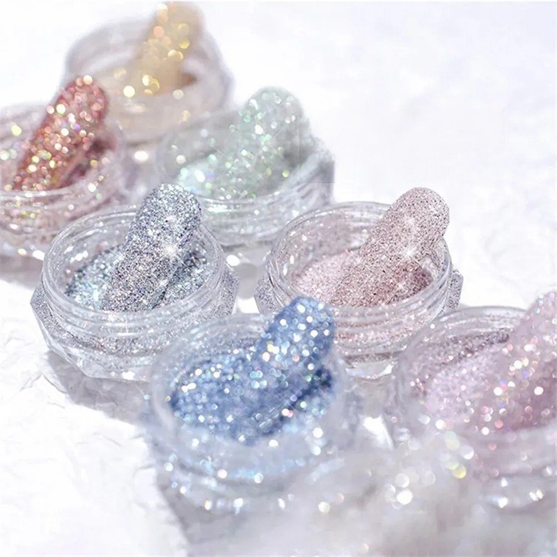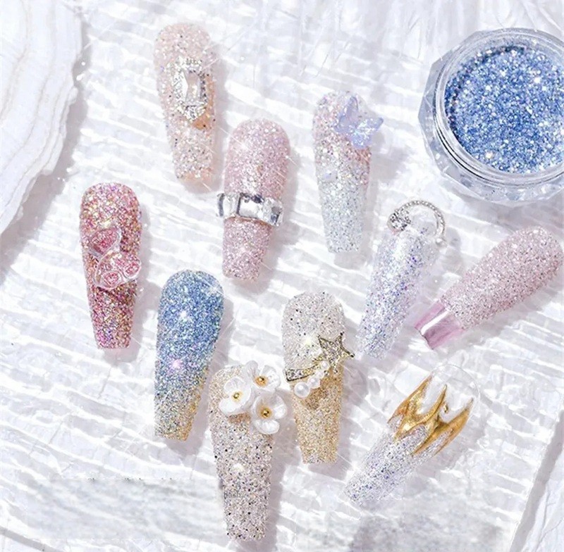 • 8 verschillende kleurvarianten van kristallen diamantpoeder voor nagels.