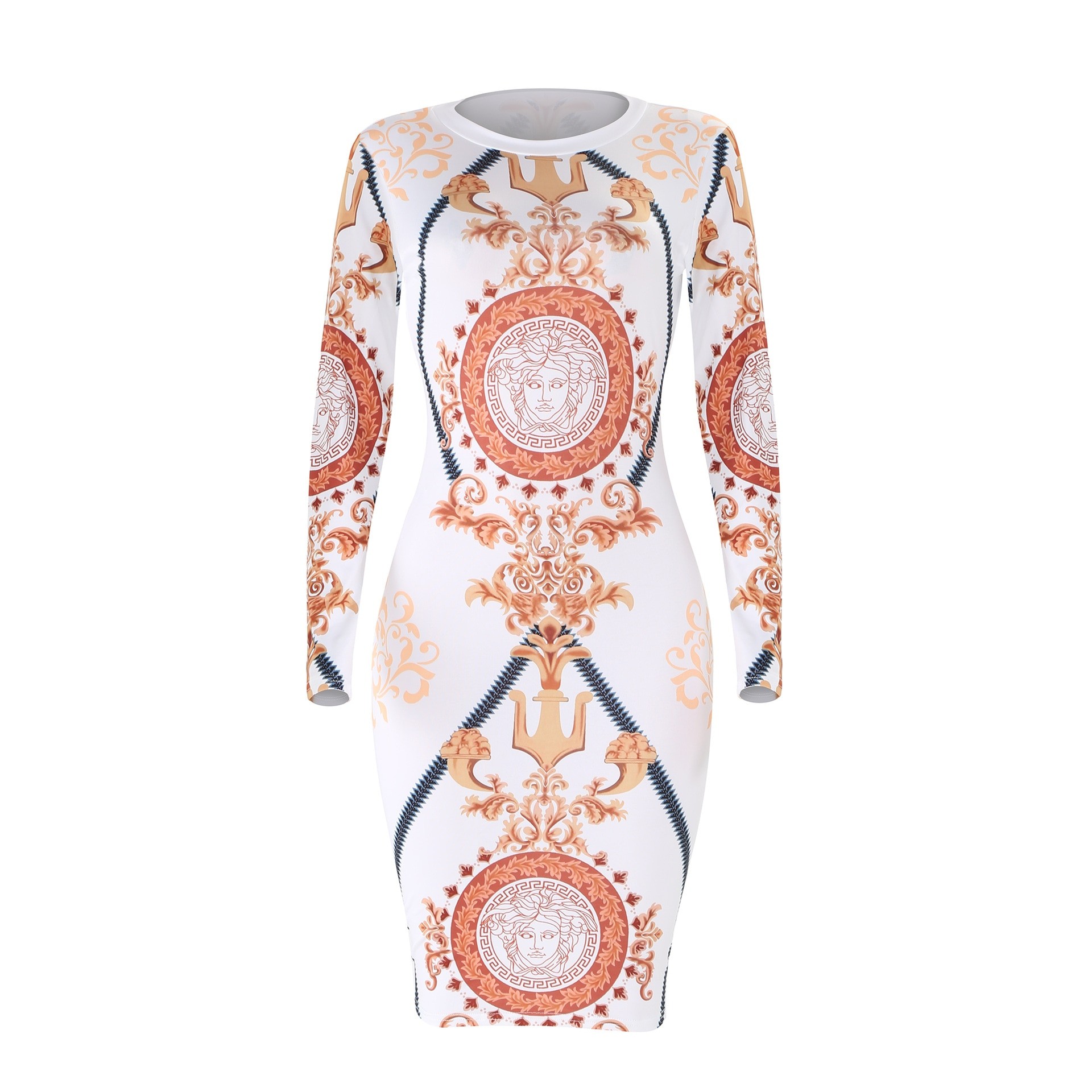Damesjurk in midilengte met ronde hals en lange mouwen.