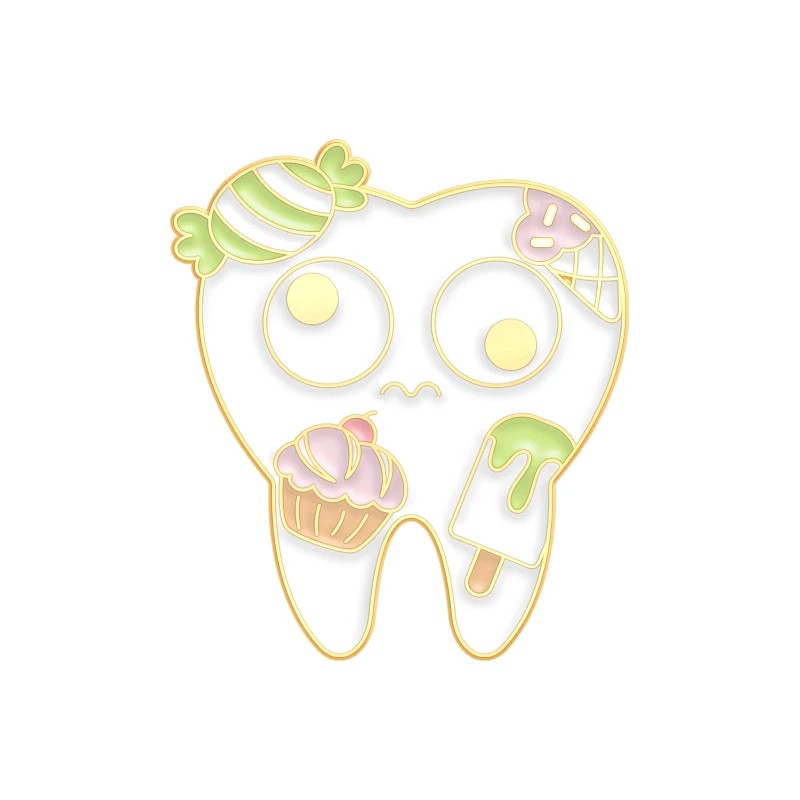 De vorm van de tand is gestileerd in een eenvoudige cartoonvorm met fijne lijnen. Ogen en een klein gezichtje geven het motief karakter, zonder te opdringerig te zijn. De kleurdetails van de zoetigheden zijn subtiel, maar voldoende onderscheidend, zodat de pin de aandacht trekt.