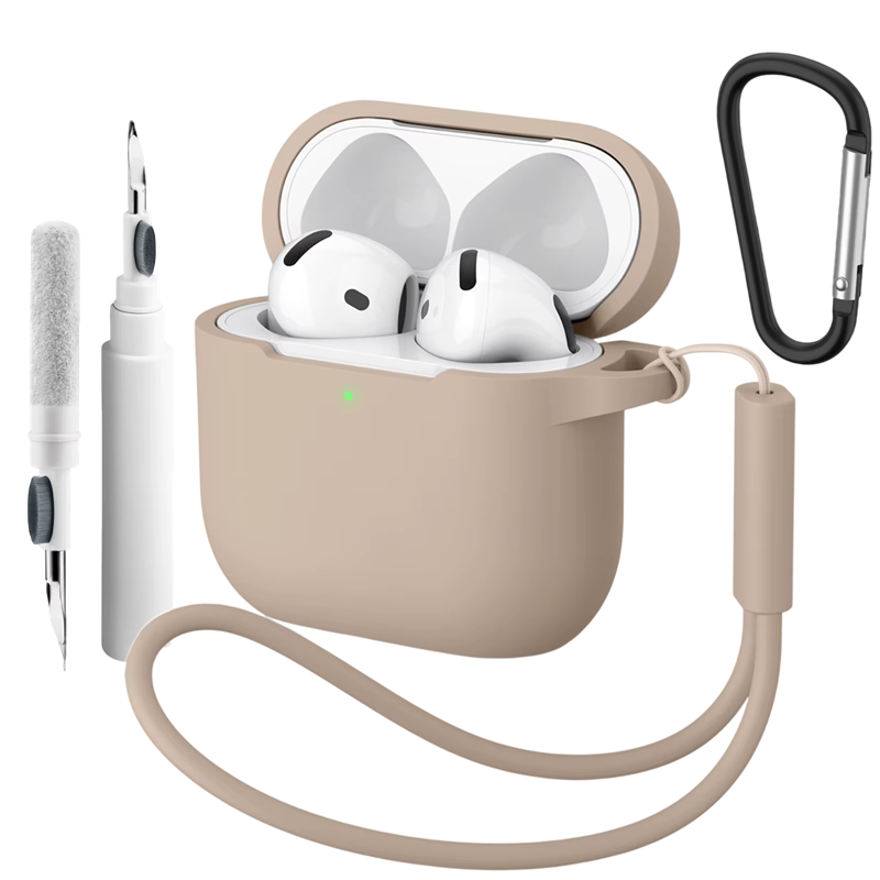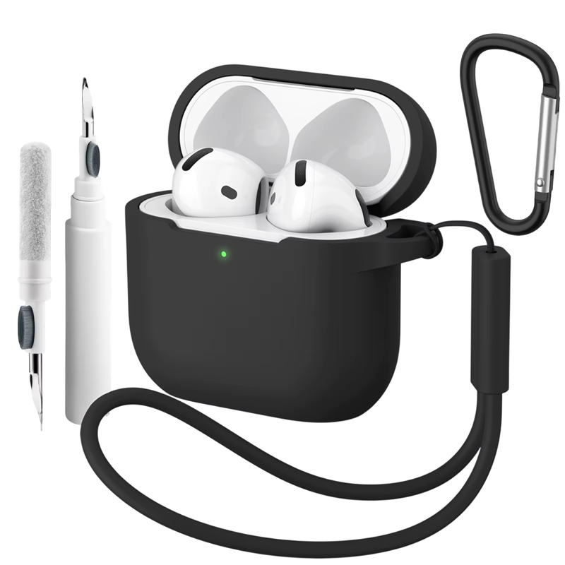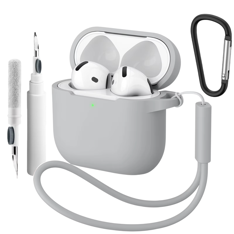 Compleet siliconen hoesje voor Apple AirPods 4 met karabijnhaak, reinigingspen en polsbandje biedt bescherming en comfortabel transport van de oordopjes. Volledige beschrijving