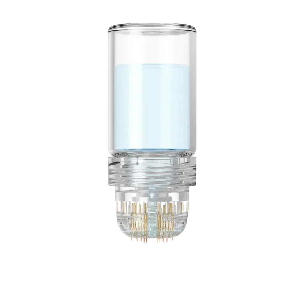 De applicatiekop bevat 20 pinnen micro-naalden, die zorgen voor een gelijkmatig contact met het huidoppervlak. De naalden zijn gemaakt van titanium, een sterk en duurzaam materiaal dat geschikt is voor herhaald gebruik. De constructie van de applicator is ontworpen om stabiel en goed hanteerbaar te zijn bij elke applicatie.