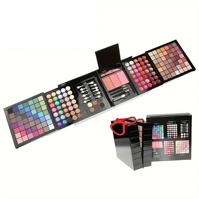 Cosmetica set 177 kleuren Oogschaduw Blush Lipgloss Concealer Compleet make-up set met spiegel in cadeauverpakking Professionele cosmetica set bevat 177 kleuren en biedt een complete oplossing voor dagelijkse en feestelijke make-up. In één praktische verpakking vindt u een breed scala aan oogschaduws, blushes, lipgloss en concealers. Dankzij de overzichtelijke indeling en de geïntegreerde spiegel is het aanbrengen comfortabel, zowel thuis als onderweg. De elegante cadeauverpakking maakt het een ideaal cadeau. De diverse kleurenpalet stelt u in staat om een natuurlijke dagelijkse look of een opvallende avondlook te creëren. Oogschaduws omvatten matte en glanzende tinten die gemakkelijk te combineren en te stapelen zijn. Blushes geven de huid een frisse uitstraling en lipgloss benadrukt de natuurlijke schoonheid van de lippen. Concealers helpen de huidtint te egaliseren en kleine imperfecties te verbergen.