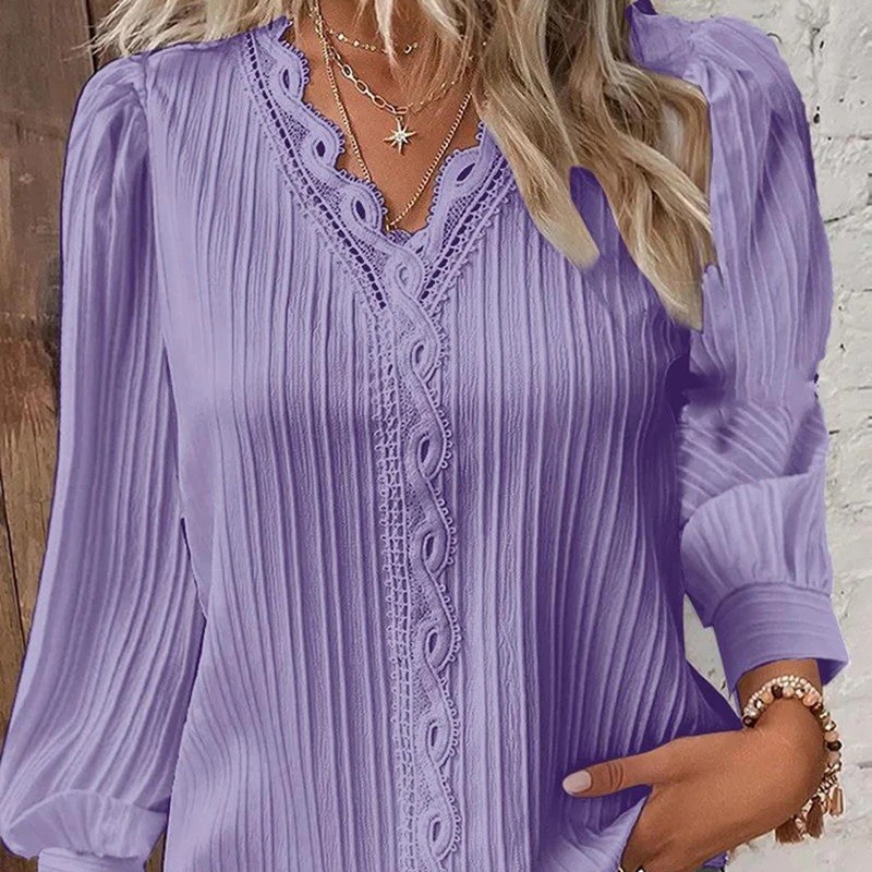 Startpagina Startpagina Kleding en accessoires Dameskleding Dames blouses Dames blouses met lange mouw Dames gewatteerde kanten blouse met V-hals Lichtgewicht elegant shirt met lange mouwen Delicate details Ideaal voor sociale gelegenheden