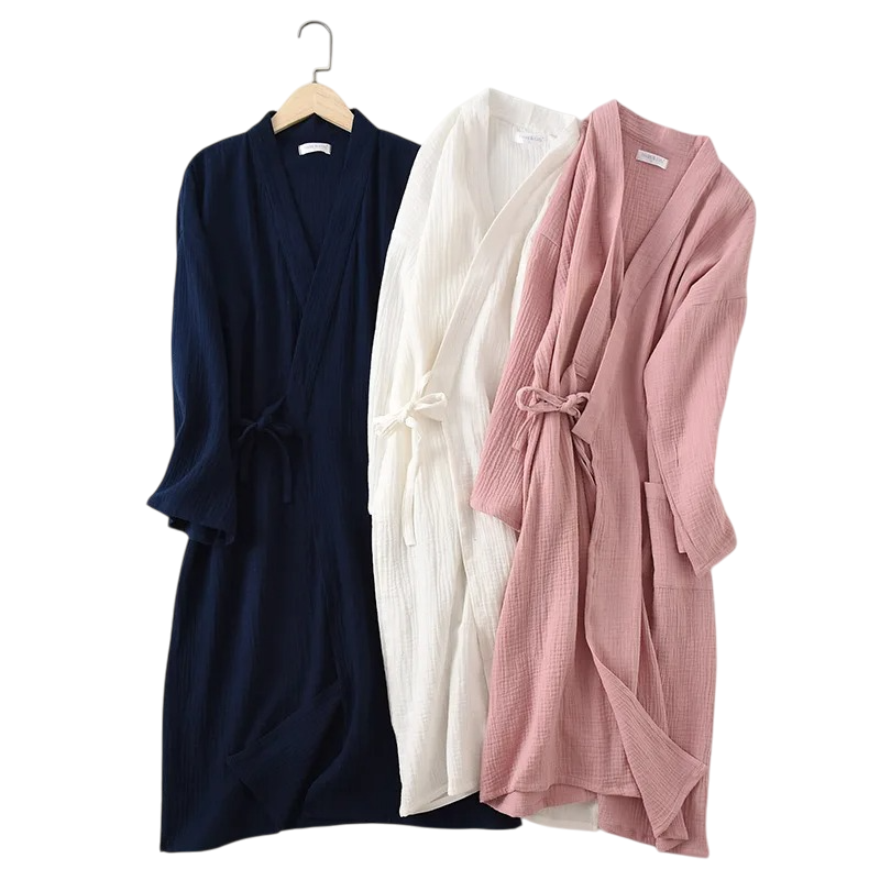 Deze badjas is ideaal voor de ochtendroutine, avondmomenten van ontspanning of als een lichte aanvulling op nachtkleding. Dankzij het minimalistische ontwerp heeft het een elegante en universele uitstraling, zodat het door vrouwen van alle leeftijden kan worden gedragen. Katoen staat bekend om zijn natuurlijke duurzaamheid, gemakkelijke onderhoud en lange levensduur, wat ervoor zorgt dat de badjas ook na langdurig gebruik in perfecte staat blijft. De kimono mouwen bieden bewegingsvrijheid en geven de badjas een originele uitstraling geïnspireerd op traditionele stijl. Door de lichtheid is de badjas ook geschikt voor reizen of weekenduitstapjes.