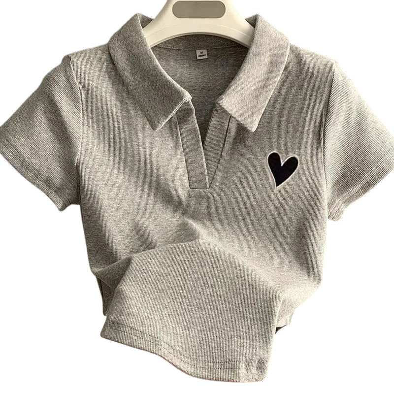 Startpagina Startpagina Kleding en accessoires Dameskleding Dames T-shirts en tops Dames T-shirts en tops met korte mouwen Dames poloshirt met korte mouwen Effen uitvoering met hartje V-hals met kraag Polyester top