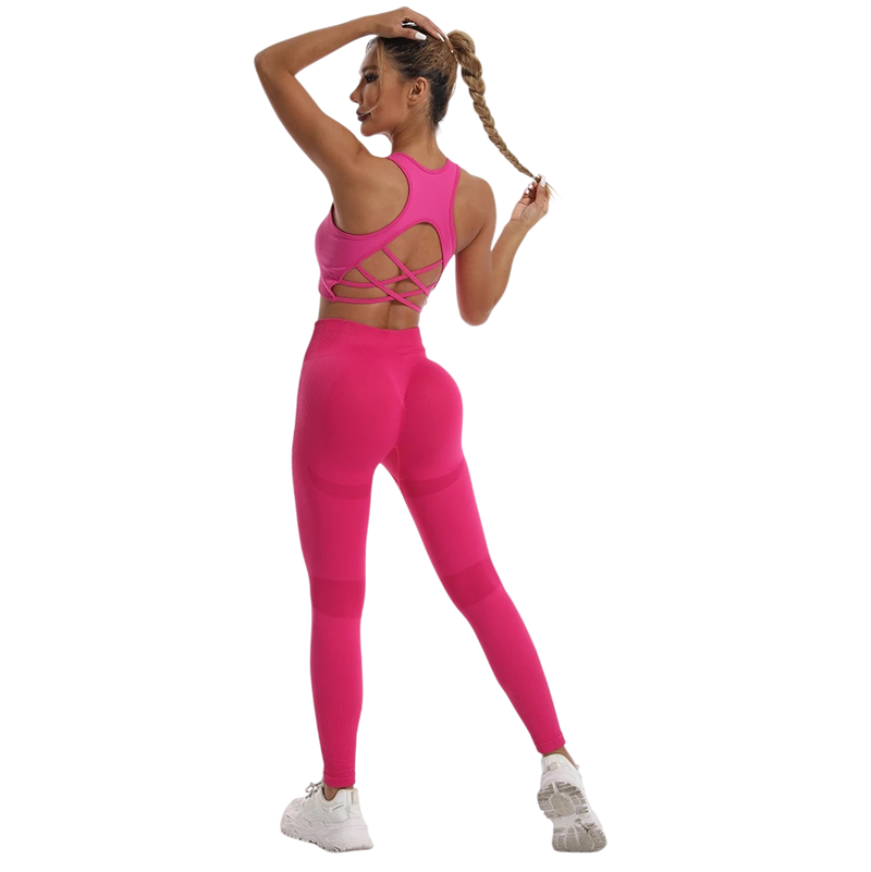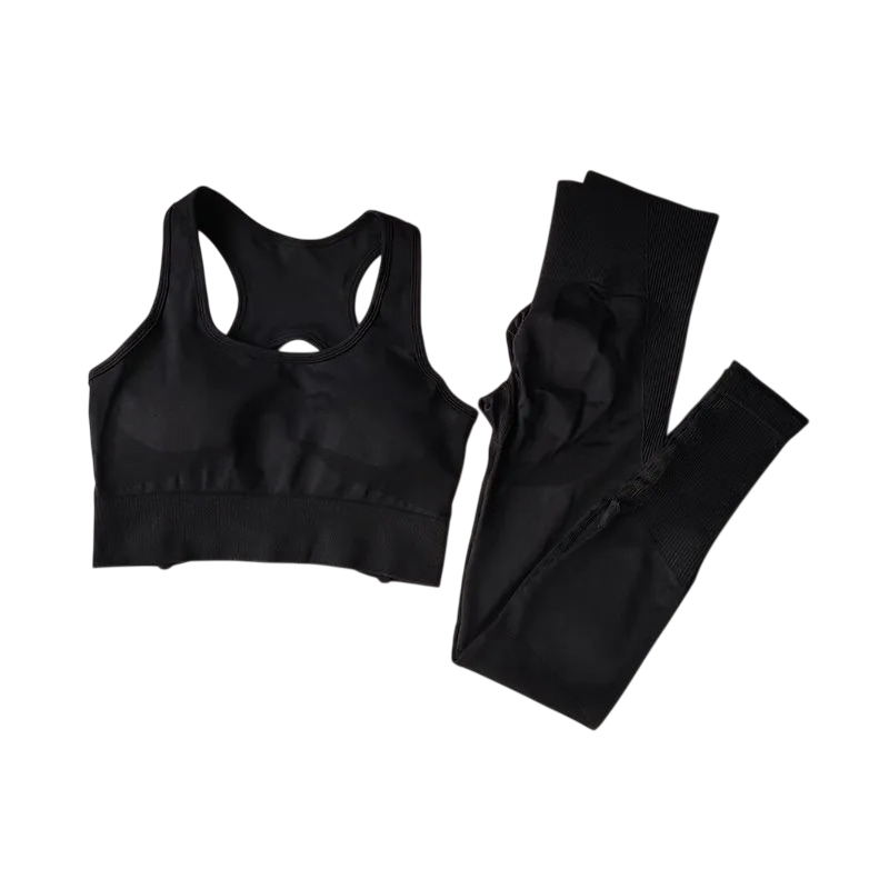 Dames sportoutfit met leggings en sportbeha van nylon en spandex. Eenvoudig ontwerp, ideaal voor fitness, training of vrije tijd, comfortabel en elastisch materiaal. Volledige beschrijving