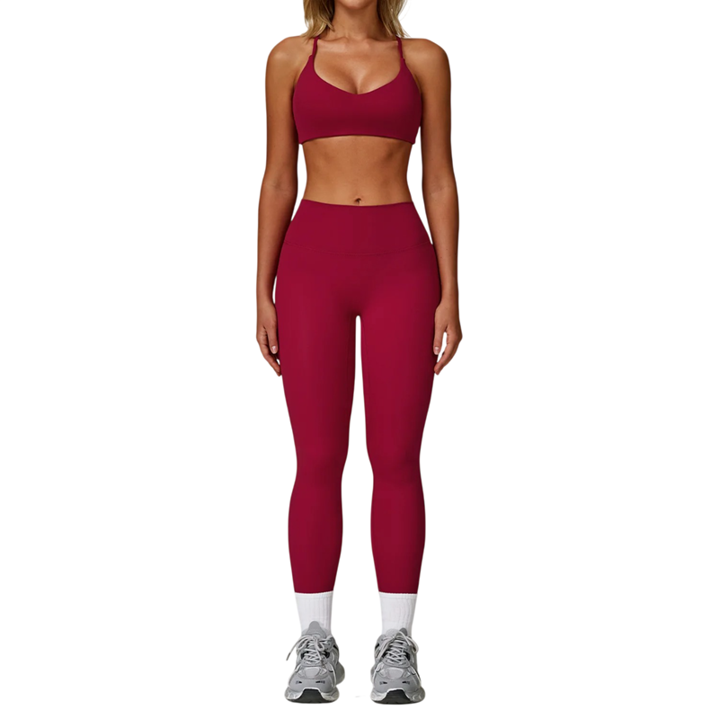 Dames sportoutfit met leggings en sportbeha van nylon en spandex. Eenvoudig ontwerp, ideaal voor fitness, training of vrije tijd, comfortabel en elastisch materiaal. Volledige beschrijving
