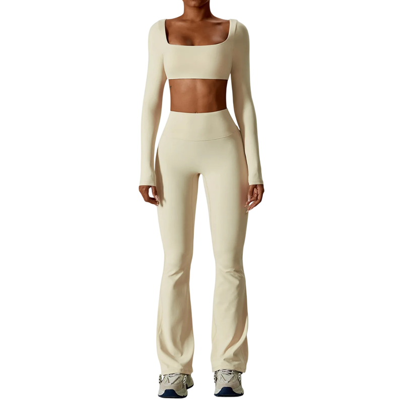 Dames sportset met broek en crop top met lange mouwen van nylon en spandex. Ideaal voor fitness, training of vrije tijd, comfortabel en elastisch materiaal. Volledige beschrijving