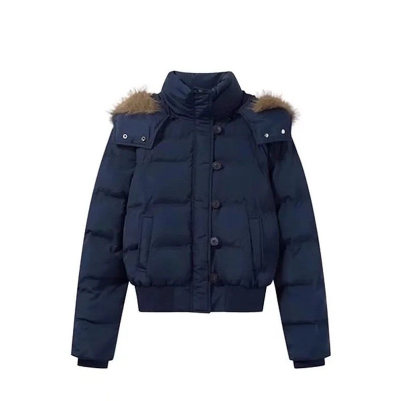 Warme katoenen winterjas met capuchon en bont, hoge kraag, dubbele sluiting en zakken biedt comfort en bescherming in koud weer. Volledige beschrijving