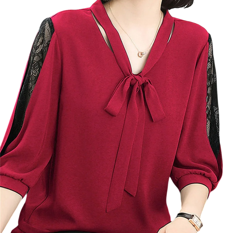 Elegante damesblouse met kanten mouwen en strik in de decolleté biedt een comfortabele pasvorm, tijdloos uiterlijk en eenvoudige combinatiemogelijkheden. Volledige beschrijving