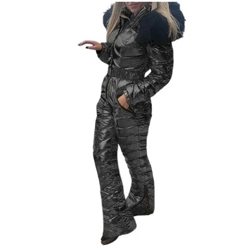 Winter damesoverall met glanzend oppervlak en capuchon met bont biedt warmte, comfort en stijl tijdens het skiën en winteractiviteiten. Volledige beschrijving