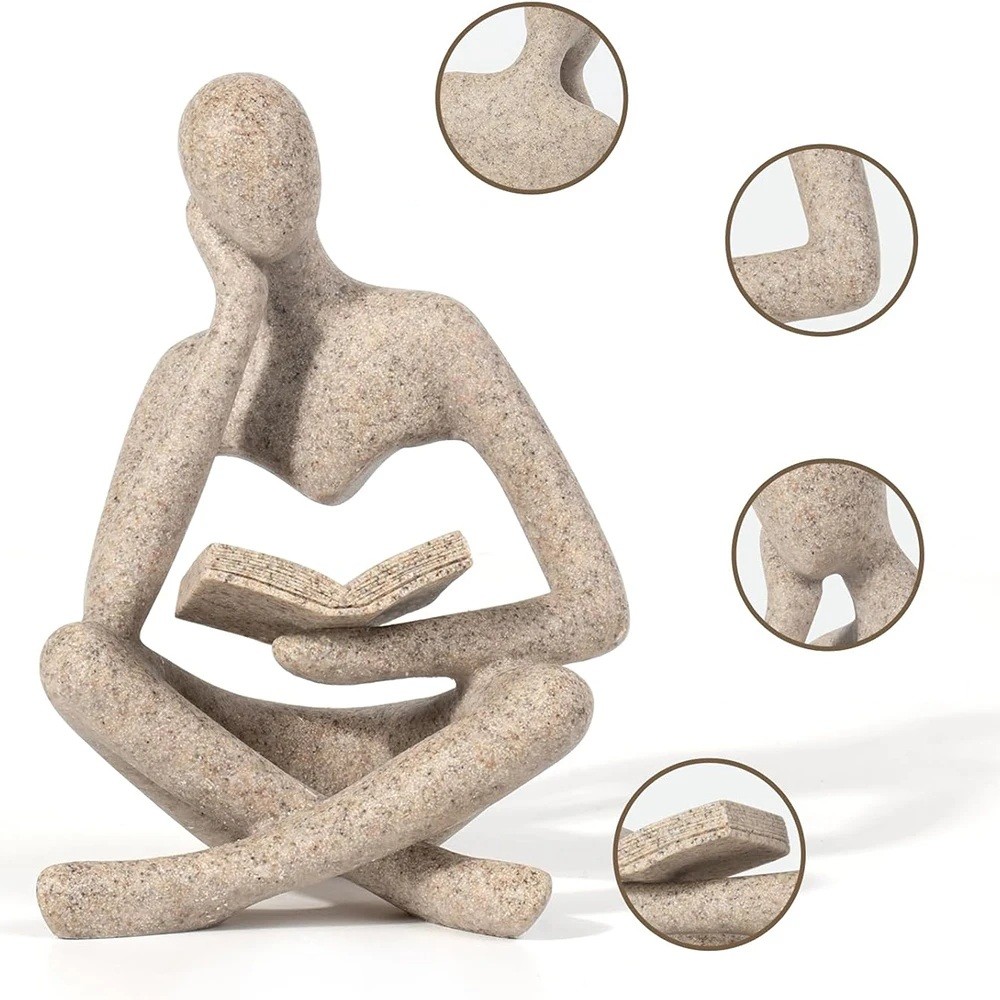 Stijlvol figuur van hars met een zittende figuur die een boek leest, geeft een artistiek en rustig karakter aan het interieur, geschikt voor zowel thuis als op kantoor. Volledige beschrijving