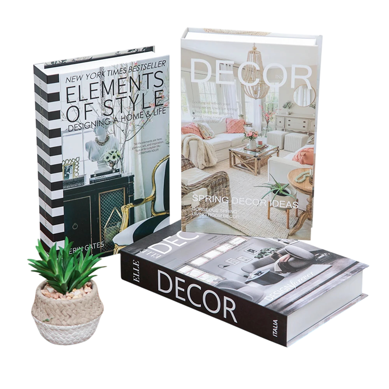 Elegante set van decoratieve nepare boeken geïnspireerd op interieurdesign en moderne woningen voegt stijl en harmonie toe aan de ruimte. De omslagen van de boeken met motieven Decor, Elements of Style en designmagazines roepen een luxueuze en hedendaagse stijl van interieurs op. De boeken zijn niet-openbaar en dienen uitsluitend als decoratie. Ze zijn perfect voor op de salontafel, dressoir, plank of boekenplank. Dankzij het realistische uiterlijk lijken ze op echte designpublicaties.