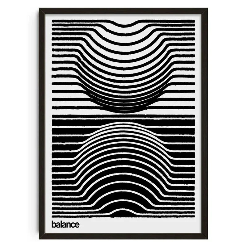 Deze designposter voor de muur met optische illusie maakt gebruik van het contrast tussen zwart en wit en speelt met herhalende lijnen die een interessant visueel effect creëren. Gebogen strepen vervormen geleidelijk en roepen een gevoel van beweging en diepte op, wat de afbeelding een opvallende dynamiek geeft. De compositie is verdeeld in twee delen die elkaar aanvullen en in balans zijn. Dankzij het eenvoudige ontwerp kan de poster gemakkelijk worden geïntegreerd in verschillende soorten interieurs. Het past zowel in moderne als minimalistisch ingerichte ruimtes.
