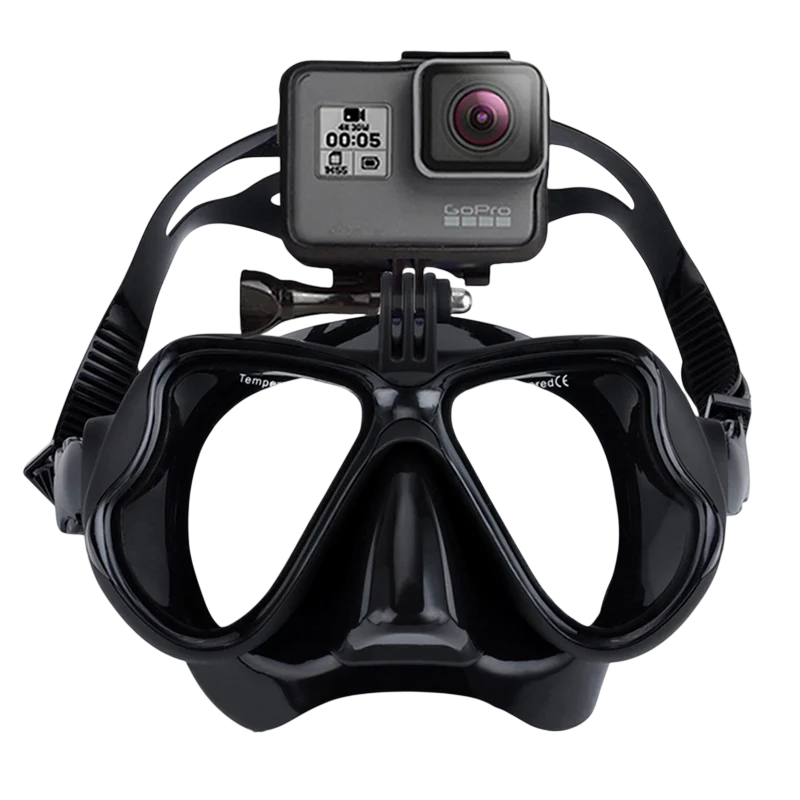 Duikbrillen met houder voor actiecamera bieden een breed gezichtsveld, duurzaam veiligheidsglas en een anti-condens behandeling voor betere zichtbaarheid. Volledige beschrijving