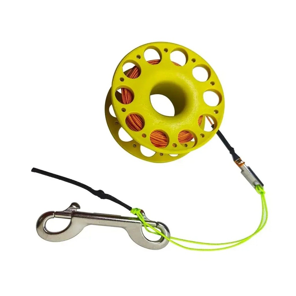 Praktische duikspoel met lijn en RVS karabijnhaak voor veilig afgeven van SMB boei, oriëntatie onder water en technisch duiken. Volledige beschrijving