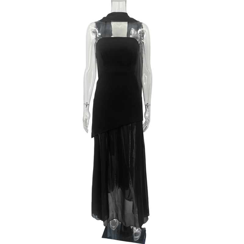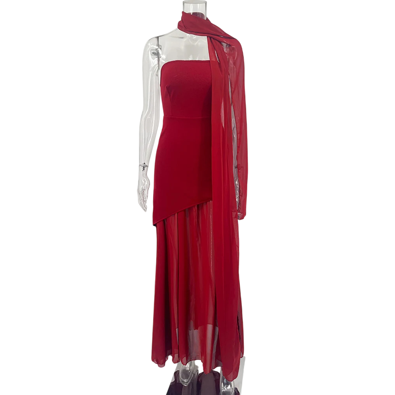 Elegante strapless jurk met asymmetrische snit Lange luchtige rok Opvallende split Lange sjaal Licht vloeiende stof voor een feestje