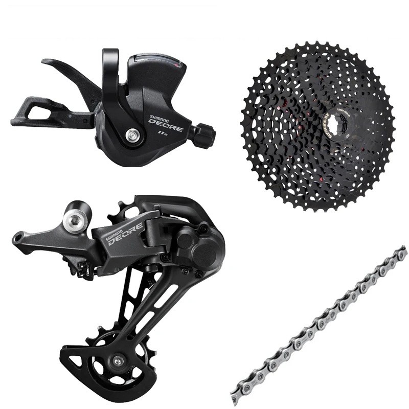 Complete fietsset met 11 versnellingen, 11–46T cassette, derailleur en ketting geschikt voor mountainbikes en rijden in terrein. Volledige beschrijving