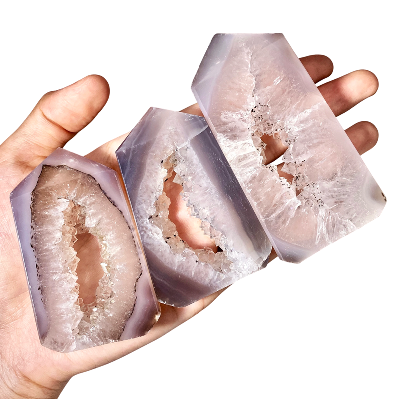 De geode achaatpunt is een natuurlijk kristal dat zich kenmerkt door een opvallende structuur en unieke uitstraling. Dit stuk met een gewicht van 50–100 g heeft een typische onregelmatige vorm, waardoor elk exemplaar uniek is. Het oppervlak van de steen is voornamelijk wit met een beige kristallijn centrum, wat een natuurlijk contrast creëert tussen de buiten- en binnenkant van de geode.