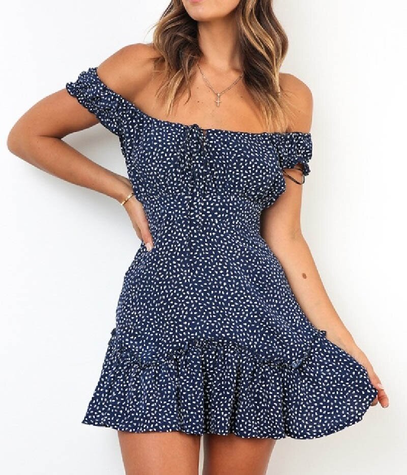 Romantische zomerminijurk met ruches en verlaagde schouders.