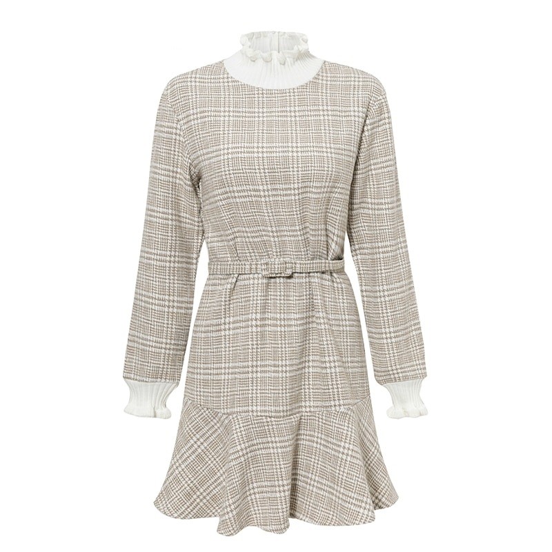 Dames herfstjurk met coltrui en geplooide rok.