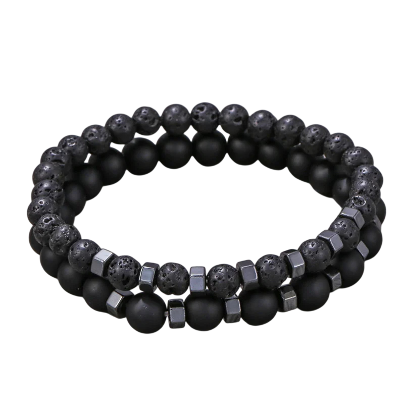 Herenarmbanden 2 stuks met matte zwarte kralen en vulkanisch gesteente natuursteen modern design