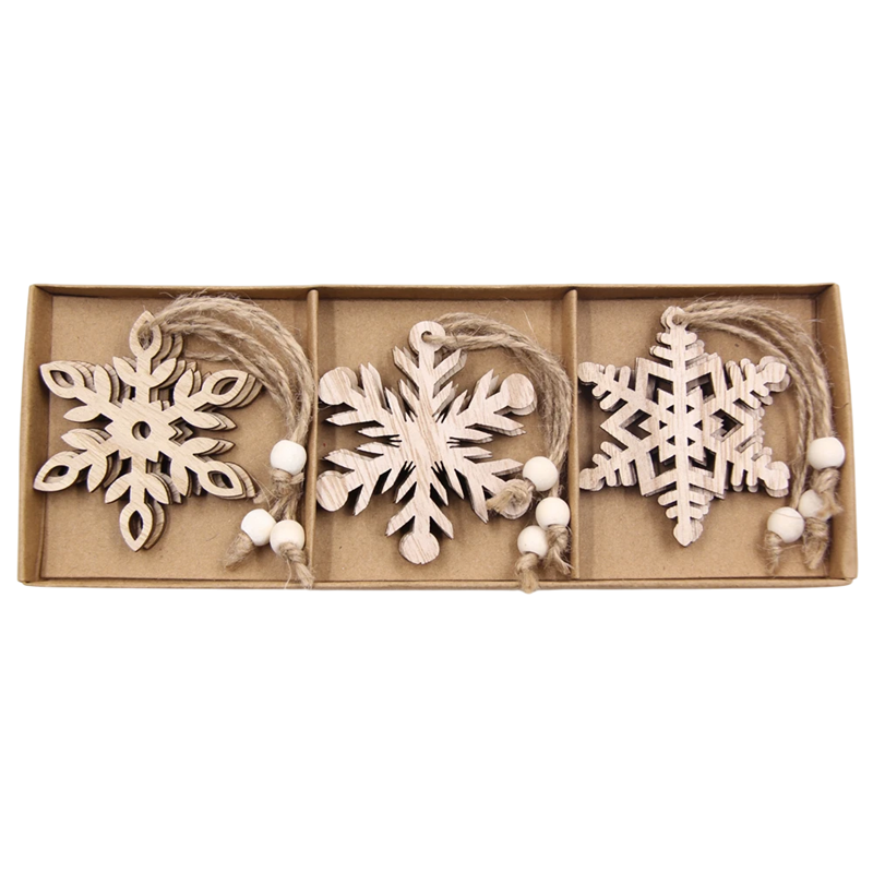 Houten hangende sneeuwvlokken 12 stuks 8,5 x 23,5 cm 3 stijlen Holle kerstversieringen van natuurlijk hout met touw Decoratie voor de boom in een doos