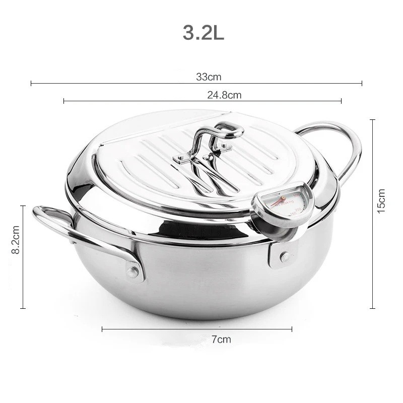 Japanse frituurpan met thermometer en afvoerrooster 24 cm 3,2 l roestvrij staal zilver voor thuis frituren