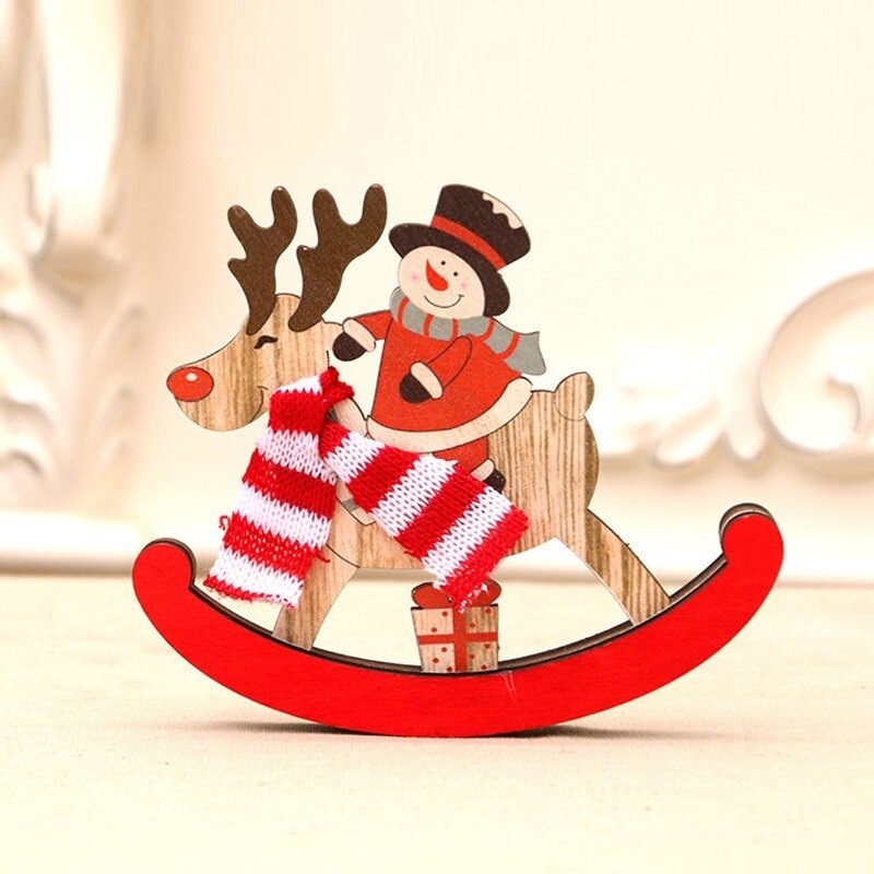 Prachtige houten decoratie: een schommelend rendier met een kerstfiguur.