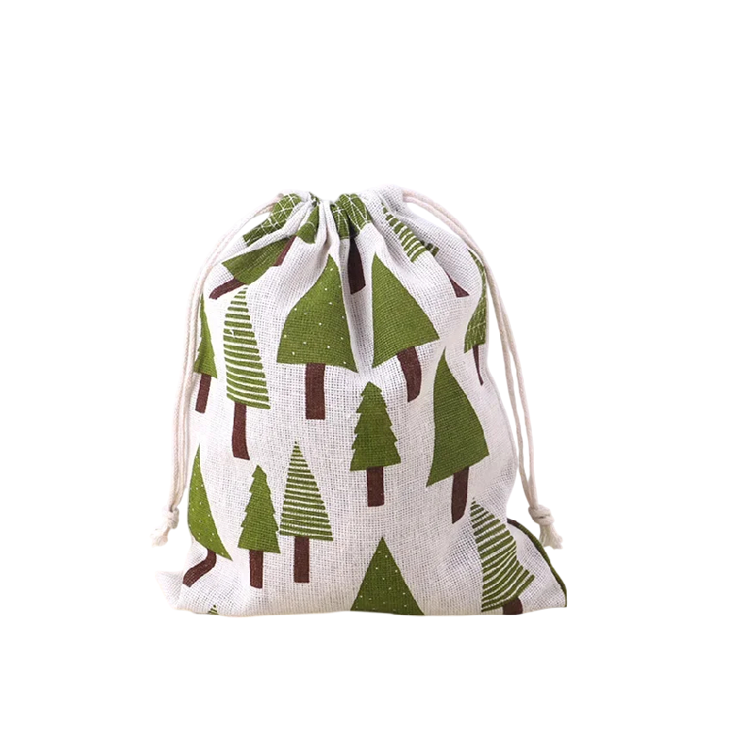 Linnen zakje met trekkoord 14x16 cm licht linnen met groene bedrukking van bomen voor het opslaan van kleine spullen en het inpakken van cadeaus