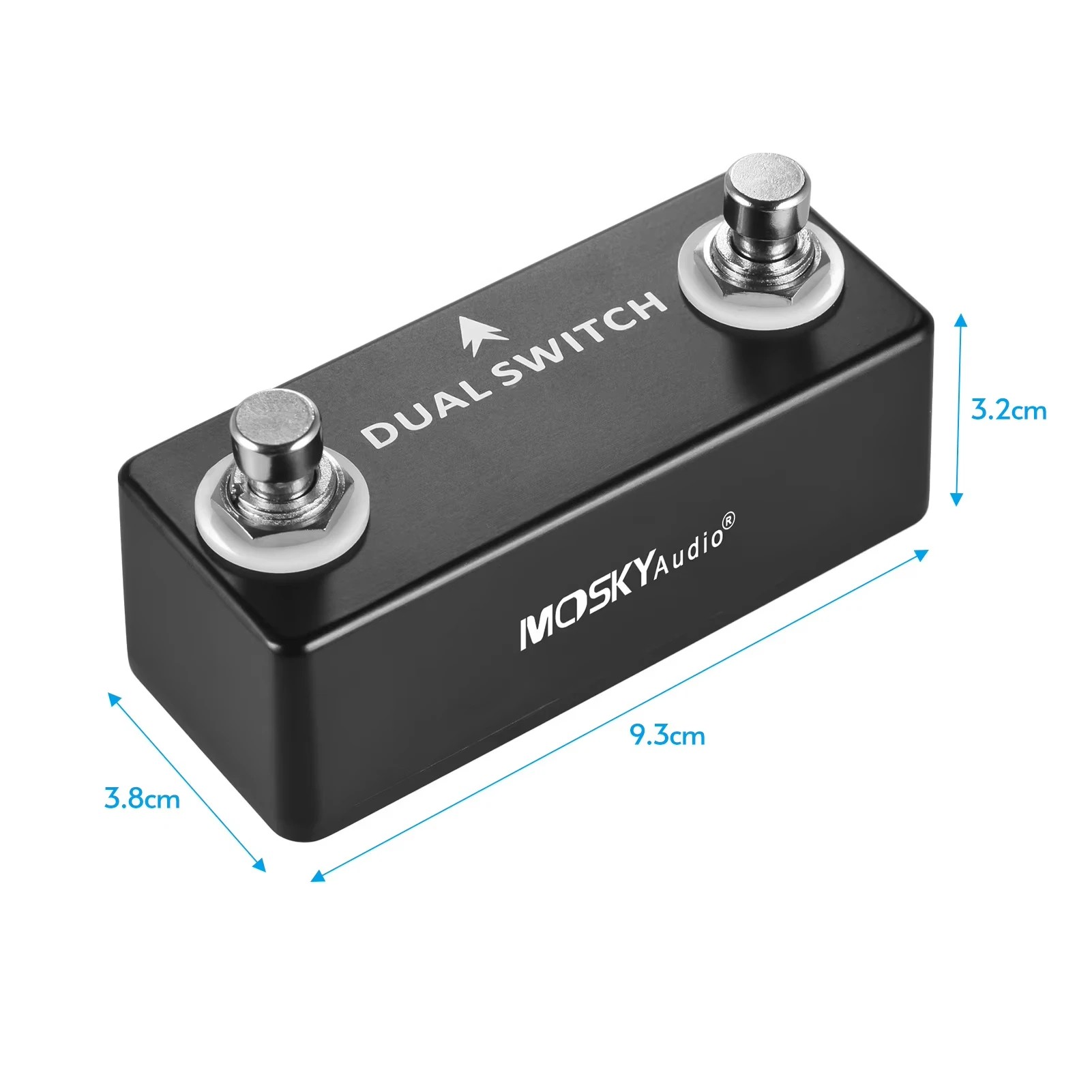 Metalen gitaarpedal Mosky Dual Switch met dubbele voetschakelaar. Universele schakelaar voor multiefecten, versterkers en opnameapparatuur. Volledige beschrijving