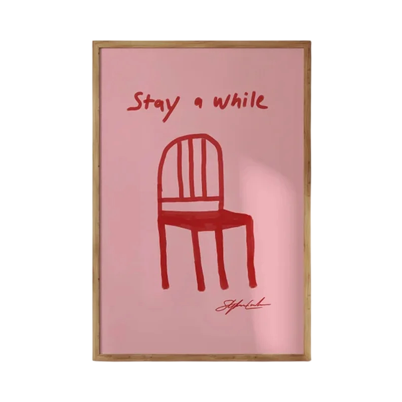 Stijlvolle poster met een roze achtergrond, een rode stoel en de tekst stay a while. Minimalistische wanddecoratie, canvasprint zonder lijst. Volledige beschrijving