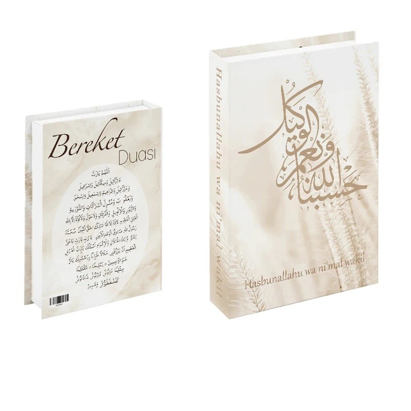 Stijlvol valse boek in een zachte beige uitvoering trekt de aandacht met opvallende kalligrafie Hasbunallahu wa ni'mal wakil op de voorkant. Het ontwerp is afgestemd op natuurlijke tinten en aangevuld met een motief van gras, wat de algehele uitstraling harmonie en een rustige karakter geeft. De rug van het boek is afgestemd op de omslag en draagt de bijpassende tekst, waardoor het realistisch lijkt wanneer het tussen andere boeken is geplaatst. Op het eerste gezicht is het een elegante decoratie, maar in werkelijkheid verbergt het een geheime opbergruimte.