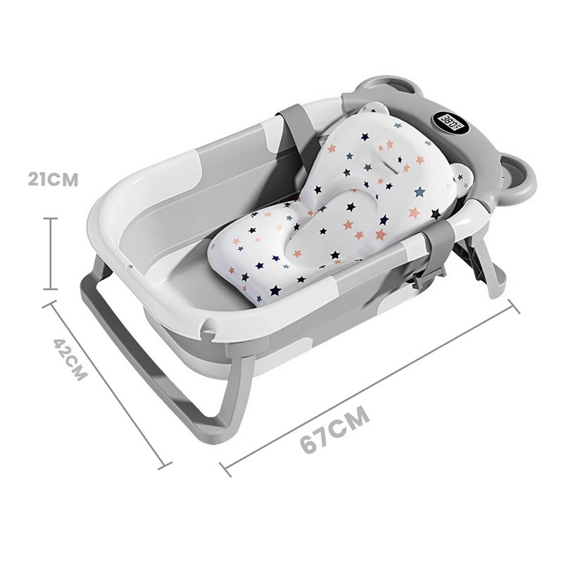 Bij het badje hoort een zacht drijvend kussen, dat ondersteuning biedt aan het kind tijdens het baden. De gebruikte materialen zoals PP, TPE, katoen en spandex zorgen voor een combinatie van sterkte en flexibiliteit. De constructie is ontworpen om stabiel te zijn tijdens gebruik en tegelijkertijd opvouwbaar bij opslag. De afmetingen van het badje maken comfortabel gebruik mogelijk voor pasgeborenen en kleine kinderen.
