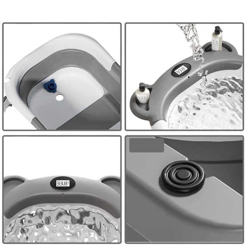 Praktisch opvouwbaar badje voor baby's met geïntegreerde thermometer en zacht kussen. Ruimtebesparende oplossing voor comfortabel baden thuis en onderweg. Volledige beschrijving