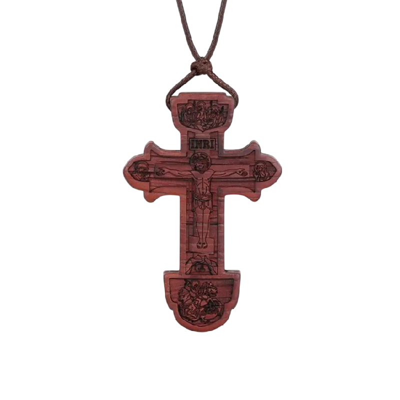 De orthodoxe halsketting met houten kruis is een opvallende accessoire met een traditioneel motief. De hanger valt op door de gedetailleerde reliëfverwerking, die meteen opvalt. Dankzij het natuurlijke materiaal heeft de halsketting een natuurlijke uitstraling en kan deze goed gecombineerd worden met verschillende kledingstijlen.