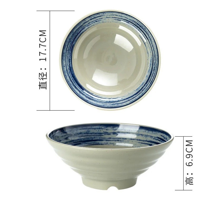 Porseleinen kom in Japanse stijl 600 ml met een crèmekleurige ondergrond en blauwe gestreepte rand 17,7 x 6,9 cm voor noedelsoep