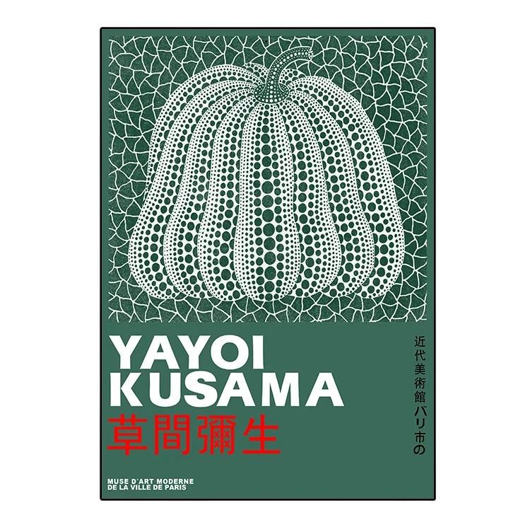 Poster afbeelding pompoen Yayoi Kusama 50 x 70 cm canvas print groene achtergrond witte stippenpatroon zonder lijst wanddecoratie interieur
