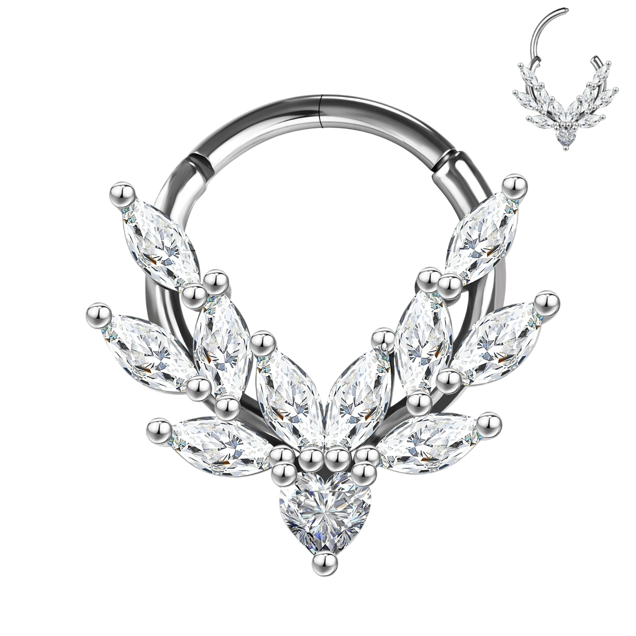 Ronde piercing met zilveren steentjes en fijne details biedt een subtiele glans en tijdloze uitstraling, geschikt voor dagelijks gebruik. Volledige beschrijving