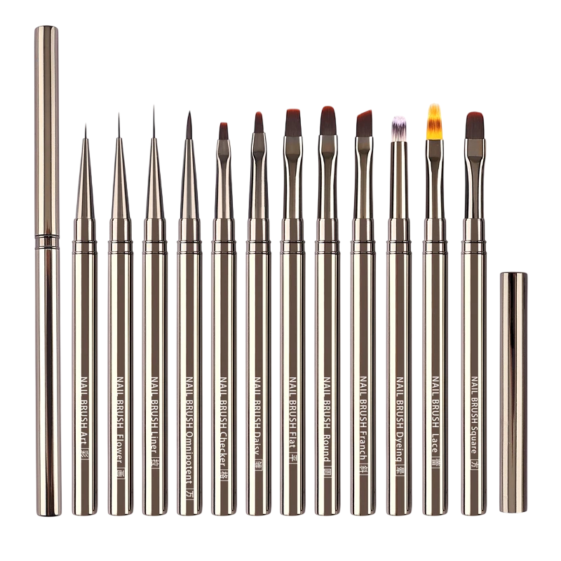 Set van 12 stuks nagelborstels Metalen handvat Verschillende maten Nylonvezel Robuuste koperen buis Nail art tekenen Cosmetische set