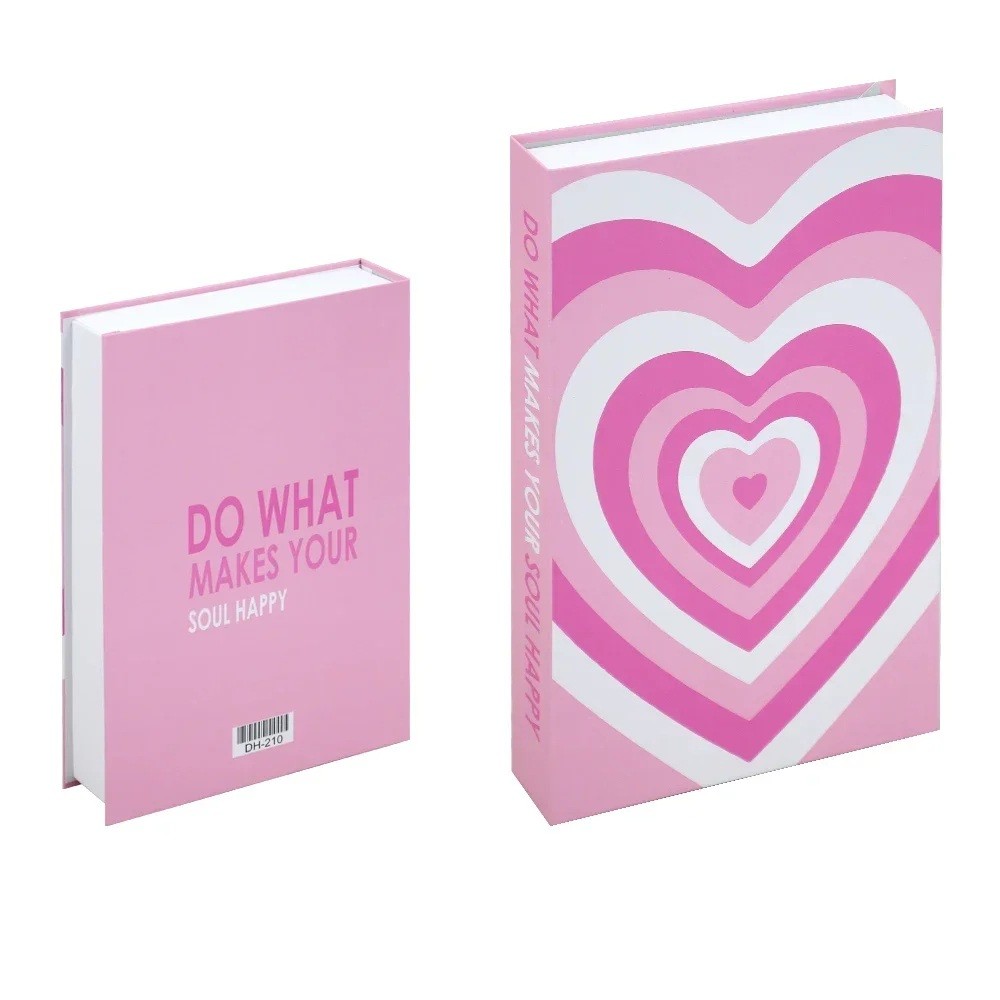 Romantisch vals boek met opbergruimte in roze uitvoering valt op door het opvallende motief van concentrische harten en de inspirerende tekst „Do What Makes Your Soul Happy“. Op het eerste gezicht lijkt het een stijlvolle designpublicatie die elke boekenkast, plank of nachtkastje opfleurt. In werkelijkheid verbergt het echter een praktische ruimte voor het veilig opbergen van uw spulletjes.