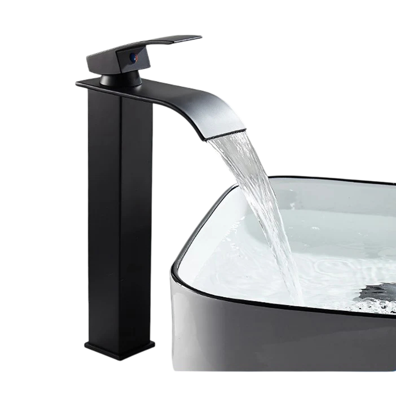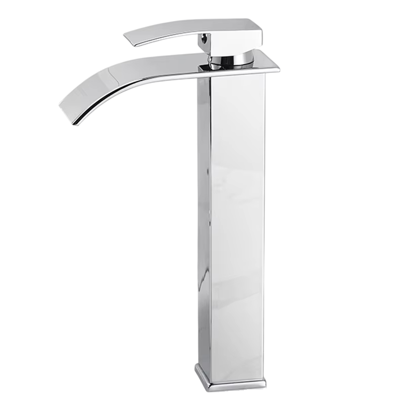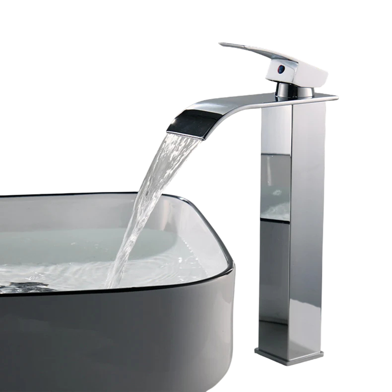 Moderne waterval kraan van roestvrij staal met warm en koud water functie. Biedt een elegant design, eenvoudige installatie en een stille, vloeiende waterstroom. Volledige beschrijving