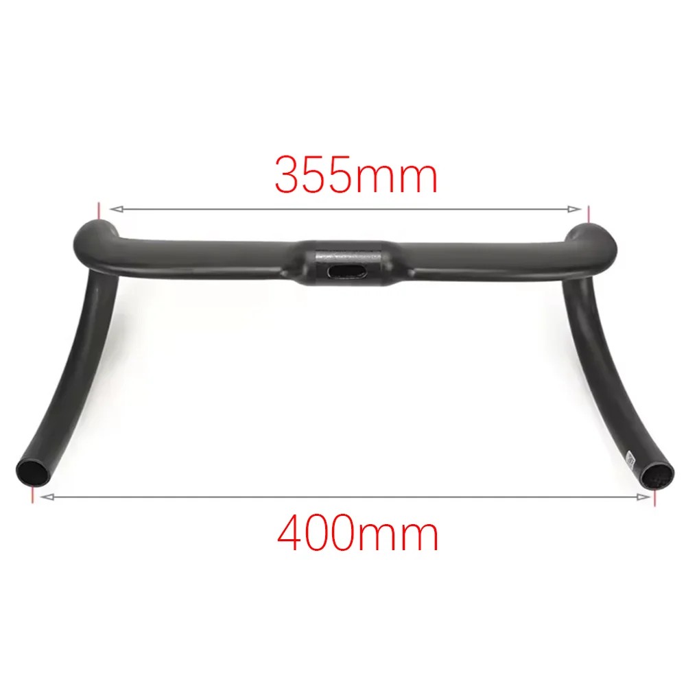 De totale breedte van het stuur bedraagt 400 mm, wat zorgt voor stabiele fietshandling en vertrouwen bij het besturen. De bovenste sectie heeft een breedte van 355 mm, die een natuurlijke houding ondersteunt tijdens het rijden op vlakke wegen en bij beklimmingen. Deze afmetingen helpen om een evenwichtige zithouding en goede controle in verschillende omstandigheden te behouden.