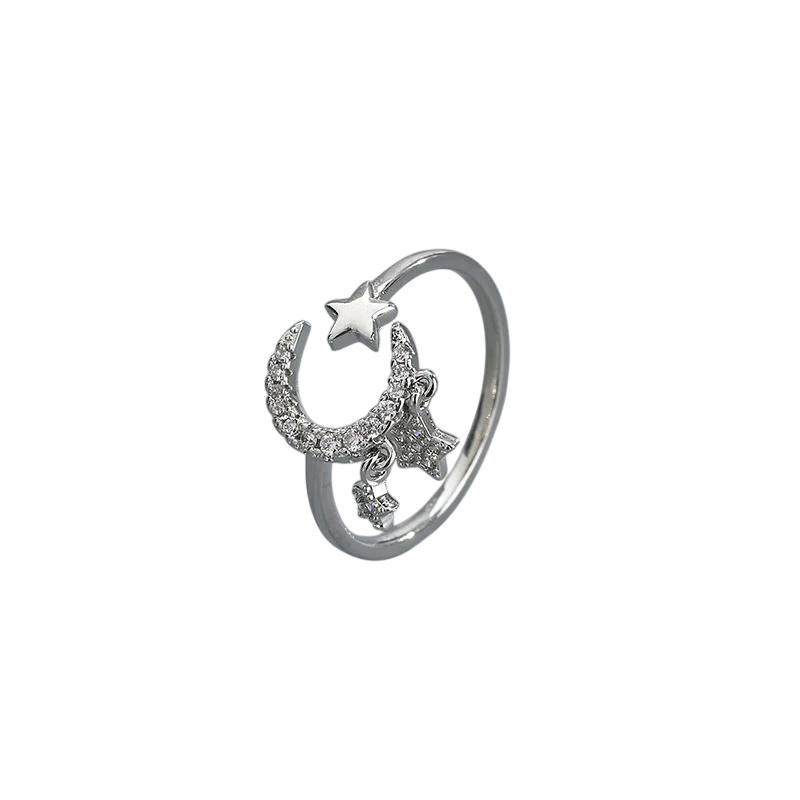 Fijne verstelbare ring met het symbool van de maan en de ster, versierd met sprankelende steentjes. Stijlvolle accessoire voor dagelijks gebruik en feestelijke gelegenheden. Volledige beschrijving