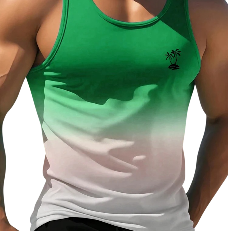 Kleurige heren tanktop van polyester met palmboom motief biedt lichtheid, draagcomfort en een opvallende zomerse uitstraling voor elke dag. Volledige beschrijving