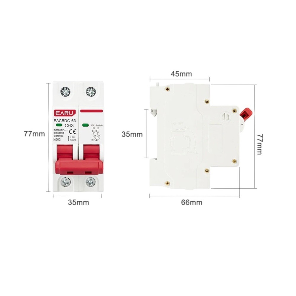 Ondersteuning tot 250 V DC maakt een breed scala aan toepassingen mogelijk in de fotovoltaïsche sector, telecommunicatie, transport en industriële technologieën. Compacte afmetingen 77 x 35 mm vergemakkelijken de installatie, zelfs in kleinere schakelkasten, en de constructie van de EACBDC-63-serie garandeert een lange levensduur.