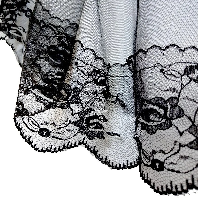 Elegante zwarte trouwsluier is een opvallend accessoire voor bruiden die de voorkeur geven aan een moderne, alternatieve of gotische stijl. De dubbel gelaagde uitvoering creëert een subtiele volumineuze en mooie gelaagde effect. De totale lengte van 75 cm zorgt voor een lichte en luchtige uitstraling die niet te zwaar aanvoelt, maar toch opvallend blijft. De rijke kantafwerking geeft de sluier een romantisch en decoratief detail.